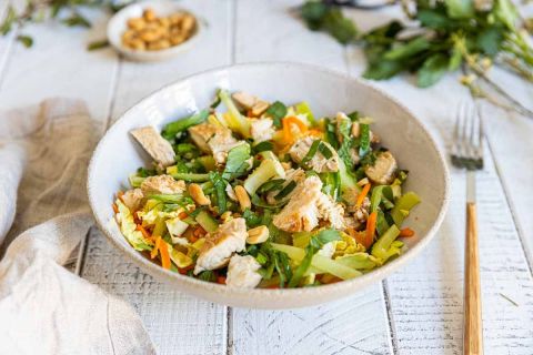 - Disposez les légumes, ajoutez le poulet tranché, arrosez de vinaigrette et terminez par des herbes fraîches et des cacahuètes concassées.