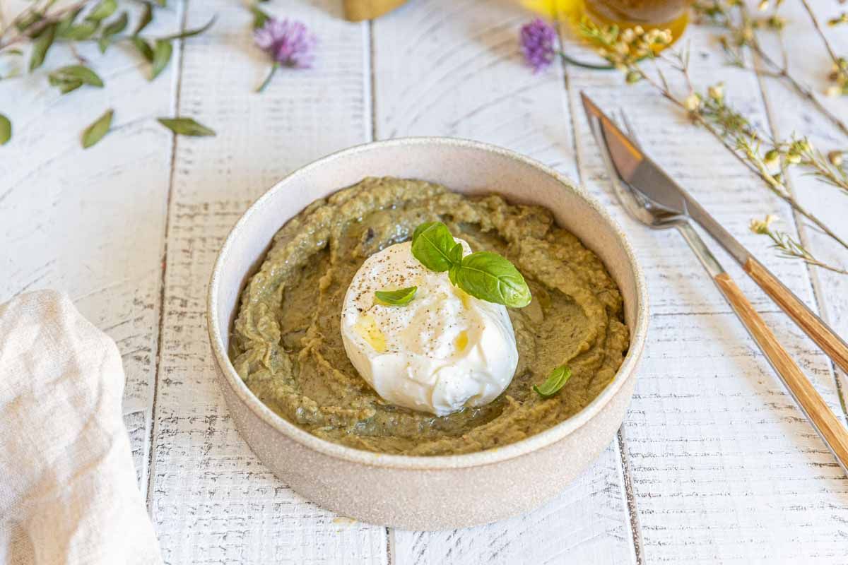 Pour le service, j’ai ajouté une demi-burrata sur chaque assiette, un filet d’huile d’olive, quelques éclats de fleur de sel et des feuilles de basilic. Accompagné de pains pita grillés, c’est une entrée qui fera forte impression !