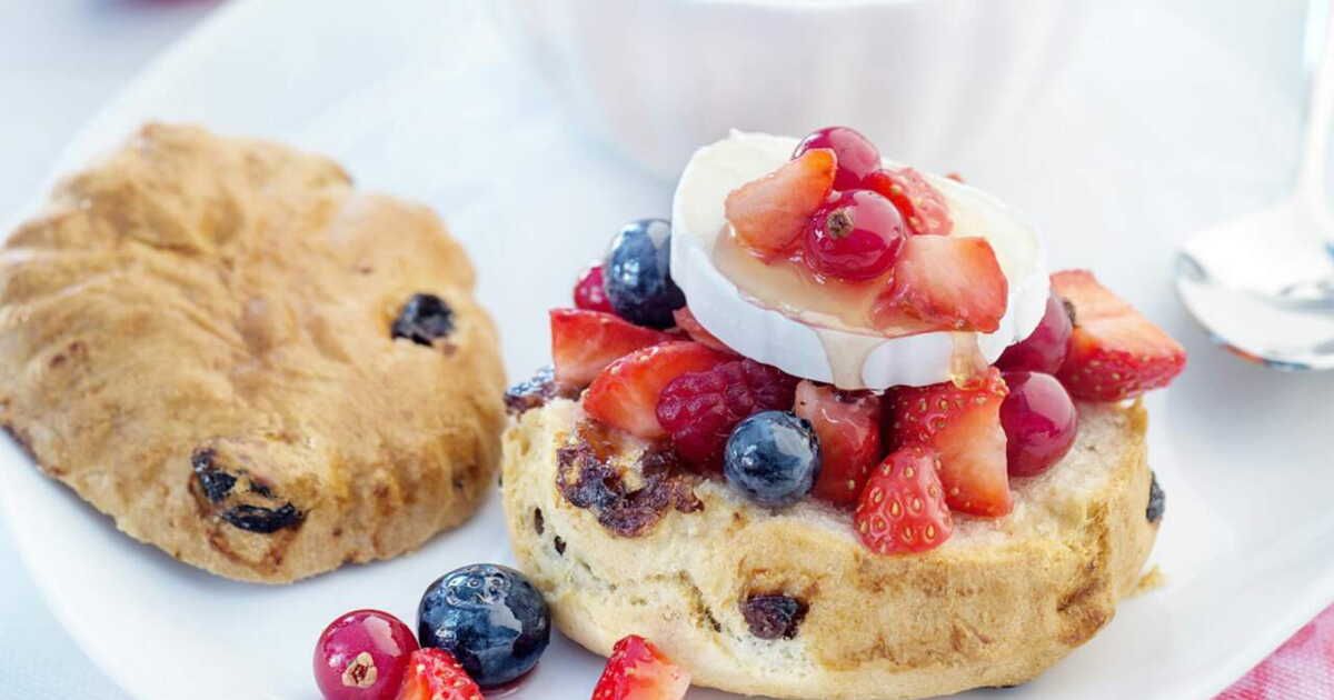- Version anglo-saxonne : thé, scones et muffins servis avec beurre et confiture, œufs brouillés au bacon, et une part de cheesecake pour finir.