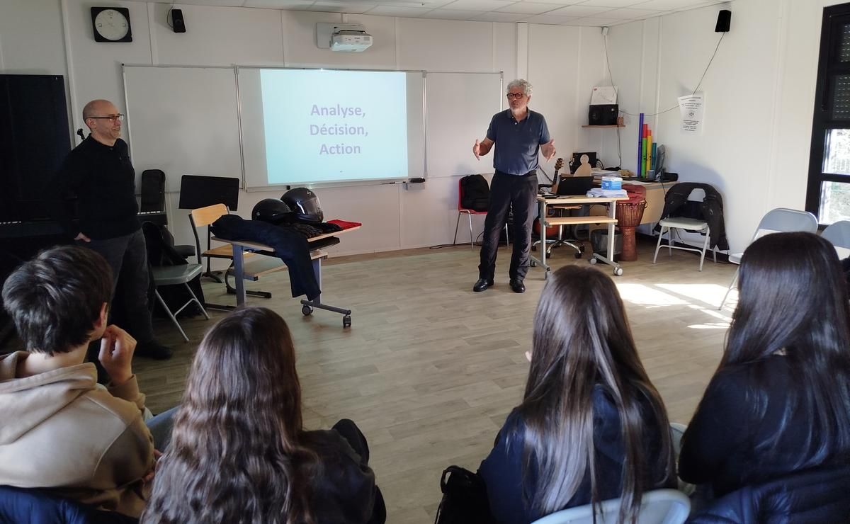 Les intervenants, Philippe Gérand et Pierre Gruson, qui militent au sein de l’antenne girondine de la FFMC, captent rapidement l'attention des élèves. Grâce à des explications théoriques, des vidéos, et des schémas clairs, ils mettent en place des tests de perception. L’un d’eux consiste à demander à un volontaire de s'asseoir au centre de la salle et de viser un feutre que Gérand déplacera vers l’avant. L’élève doit ensuite répondre à des questions sur la couleur et le positionnement de l'objet, illustrant ainsi la compréhension limitée de notre champ visuel. "La vision précise se limite à un angle de 13 à 15 degrés", souligne Gérand.